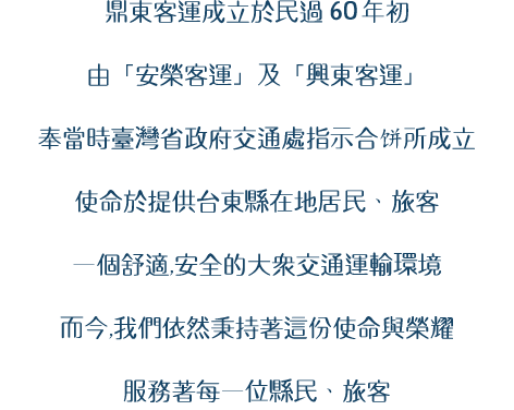 台灣由於島嶼地形的關係,東西部的交通及運被中央山脈所阻擋分割,故於早期鐵路還未發達時,客運即為最主要常運的交通工具之一,位於台灣東南方的台東縣亦是如此。
